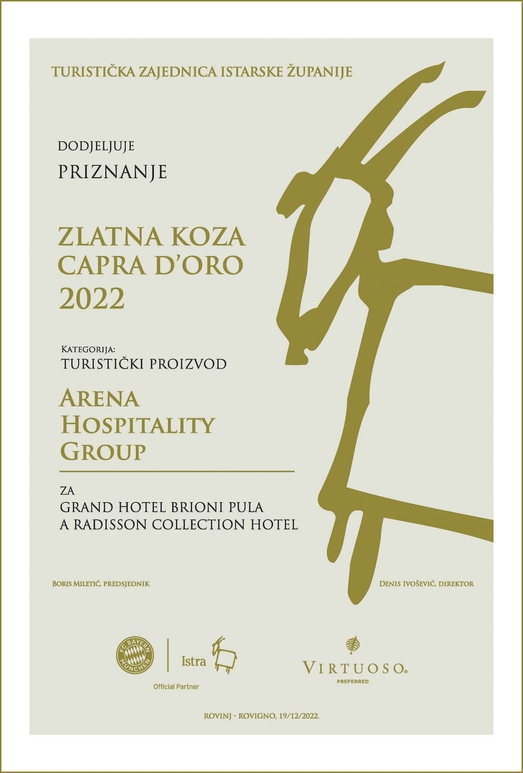 Arena Hospitality Group è il vincitore del premio Golden Goat - Capra d'oro di quest'anno nella categoria PRODOTTO TURISTICO per il Grand Hotel Brioni Pula, A Radisson Collection Hotel.